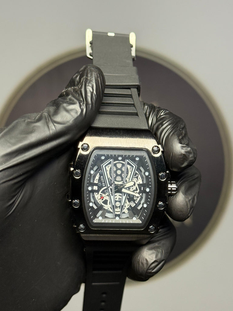 This RM style quartz watch features a bold skeleton dial with a luxury tonneau-shaped case. Designed for men who love premium style, this watch runs on reliable quartz movement for accurate timekeeping. The soft rubber strap provides comfort for all-day wear, while the modern design makes it ideal for casual, party, and everyday use. A perfect choice for those who want luxury-inspired watches at an affordable price.